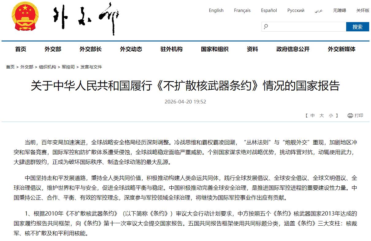 外交部发布关于中华人民共和国履行《不扩散核武器条约》情况的国家报告